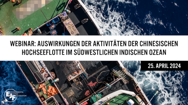 Chinas Hochseeflotte ist die größte der Welt und verantwortlich für schwere Menschenrechtsverletzungen und weitreichende illegale Fischerei. In einem Webinar mit führenden Entscheidungsträger*innen und Expert*innen in den Bereichen Meeresschutz und Fischereimanagement wurden die Ergebnisse des neuen EJF-Berichts über die Aktivitäten Flotte in Ostafrika vorgestellt und konkrete Maßnahmen für Transparenz in der Fischerei diskutiert, die helfen, illegale Aktivitäten auf den Weltmeeren zu stoppen.